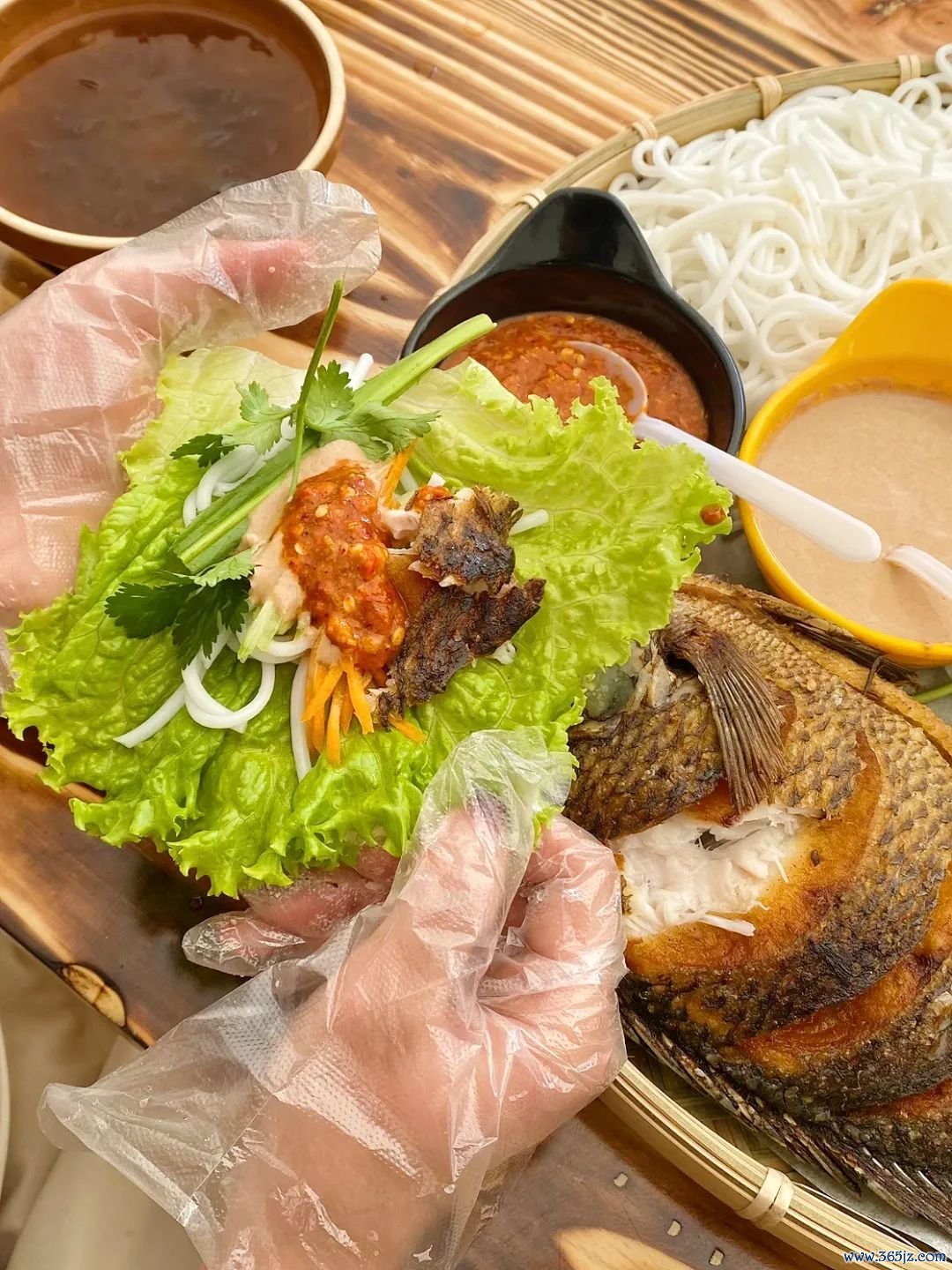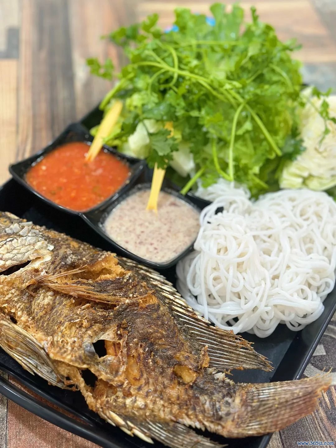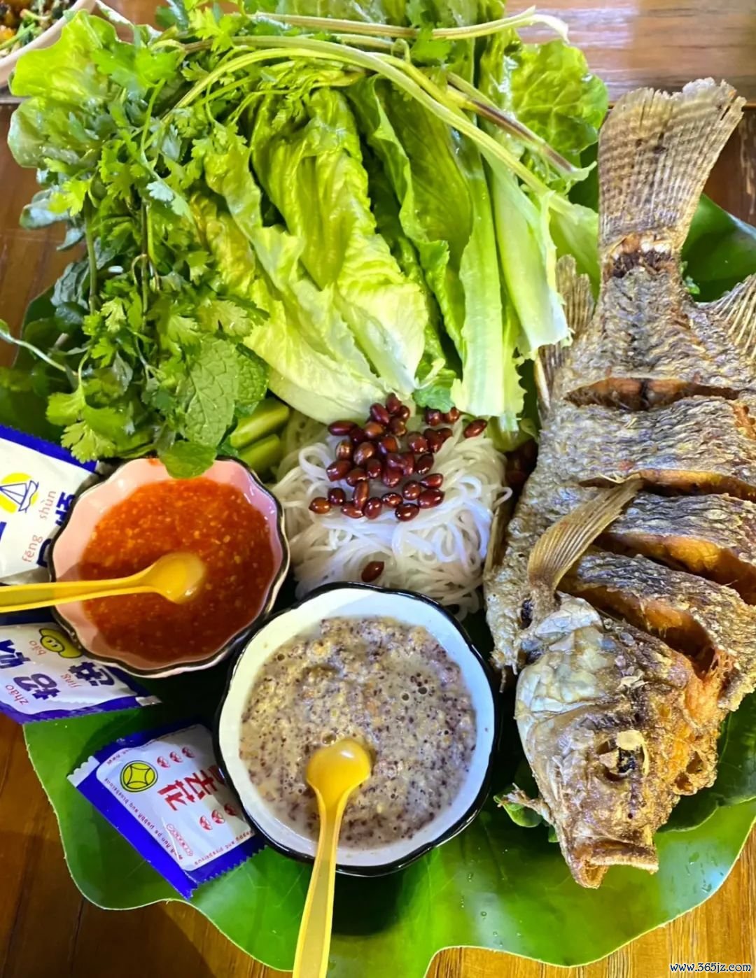 一份内部米线、烤好的罗非鱼、特制酱汁和菜叶,还有花生、香菜等小料,不可偏废。