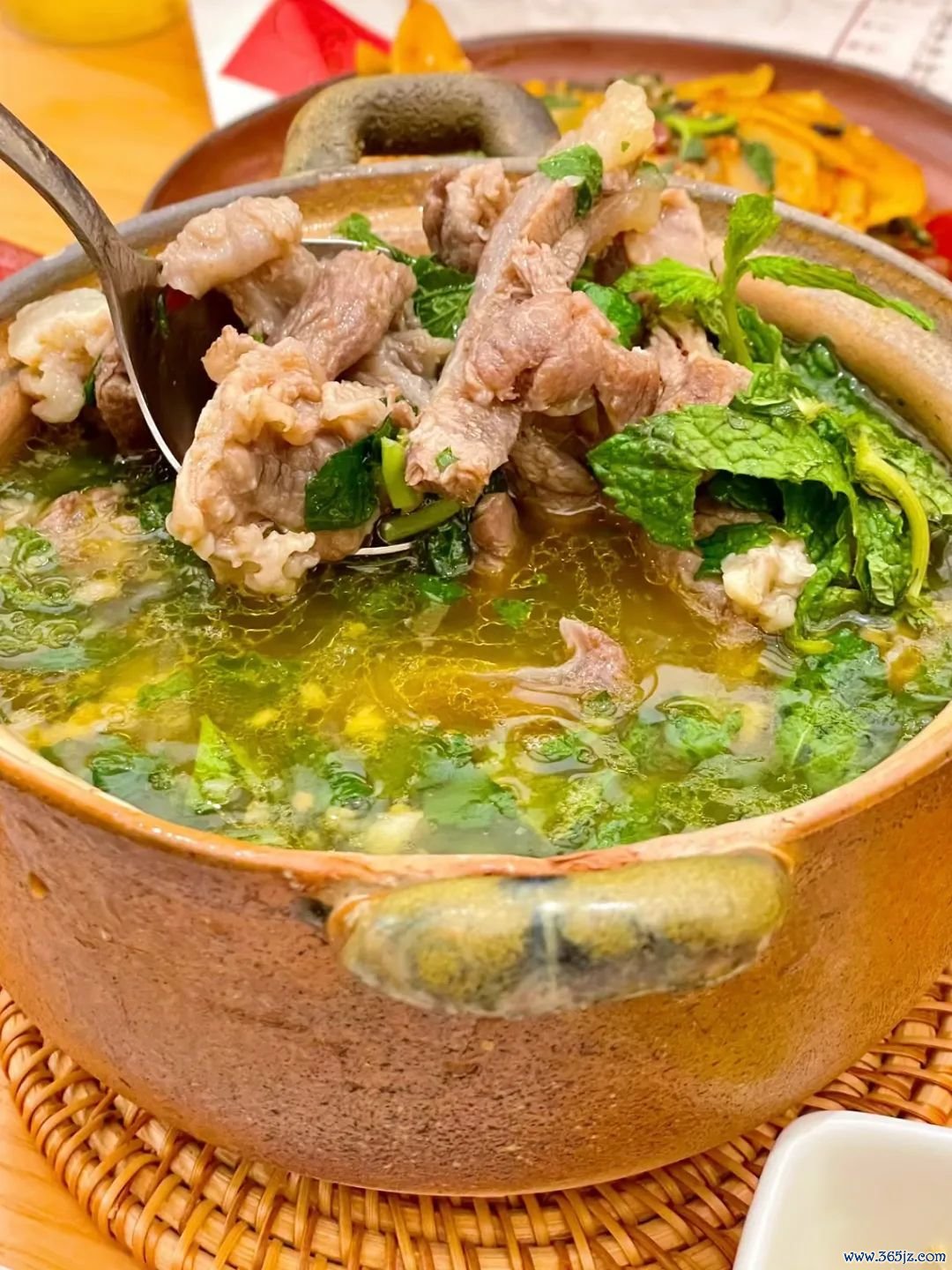 况兼念念茅菜会用到超多的香料,牛扒呼就是用念念茅加牛肉炖成的,还放了薄荷和洋丝瓜,汤底鲜浓,再搭配上胡辣椒的蘸水,一口上面。