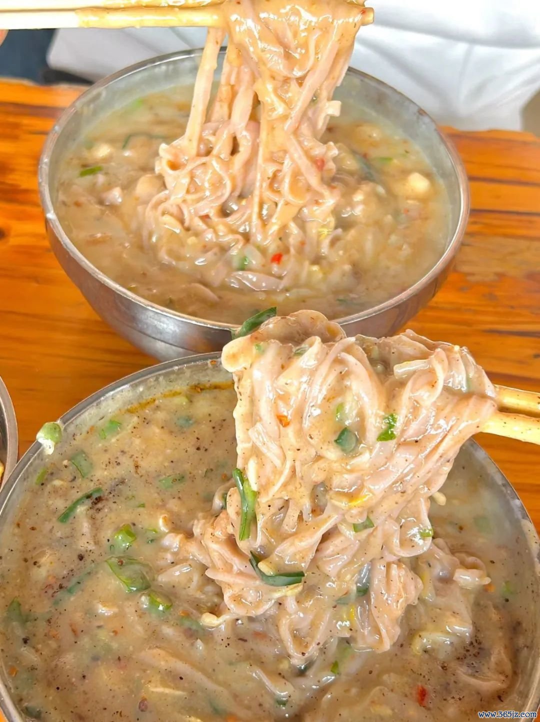 它是用米磨成米浆,然后经过多种工序作念成米干,并切成条,再舀上一勺豌豆磨成豆面粉煮成的豆面糊汤。