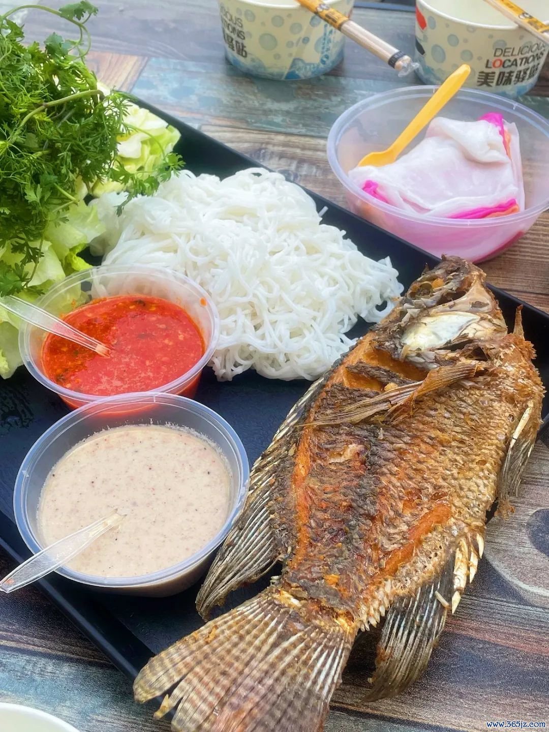 傣族东谈主称手持鱼米线叫菜包鱼,是源自泰国的脾性好意思食。