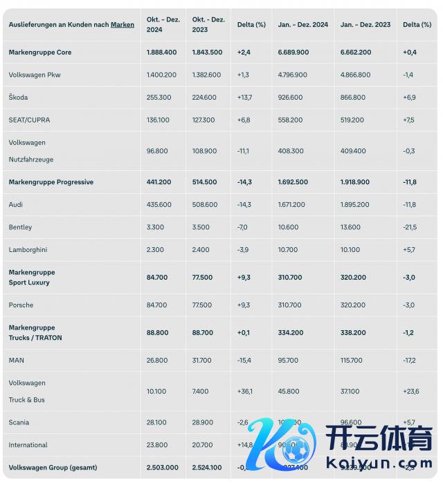 细分品牌来看,销量最大的仍然是专家品牌乘用车,2024 年累计销量 479.69 万辆,同比下滑 1.4%,其中四季度销量同比增长 1.3% 至 140.02 万辆。斯柯达年度销量同比增长 6.9% 至 92.66 万辆,其中四季度销量同比增长 13.7% 至 25.53 万辆;西雅特 /CUPRA 在 2024 年销量为 55.82 万辆,同比增长 7.5%,其中四季度同比增长 6.8% 至 13.61 万辆。比较之下,豪华品牌进展相对差劲,其中奥迪同比下滑 11.8% 至 167.12 万辆,宾利同比下滑 21.5% 至 1.06 万辆,兰博基尼则同比增长 5.7% 至 1.07 万辆;此外,保时捷同比下滑 3.0%;