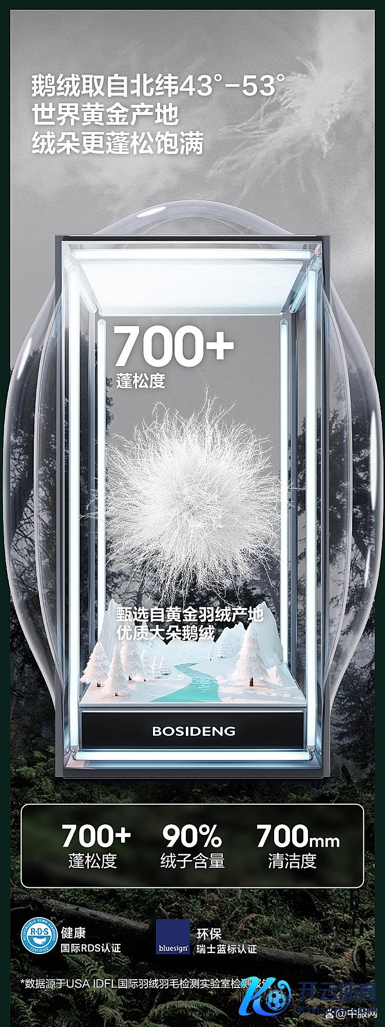 此外,波司登在御寒性能的打造上亦是不遗余力。精选自北纬43°至53°高海拔地区的黄金产地鹅绒,这一区域以自后天不良的当然条款生长出品性至极的羽绒原料。这些鹅绒的蓬松度高达700+,绒子含量达90%及以上,狭窄如羽,同期兼具至极的环保脾气和御寒性能,已通过海外RDS健康认证并荣获瑞士蓝标环保认证,为穿戴者带来优异的蔼然体验。