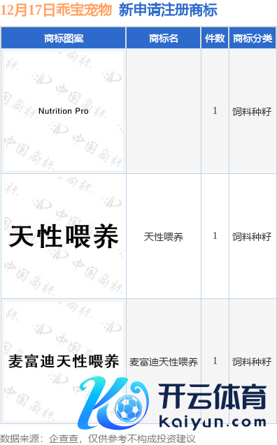本站音书,把柄企查查数据表示,近日乖宝宠物食物集团股份有限公司新提交“麦富迪天性喂养”、“天性喂养”等3件商标注册苦求。商标苦求确定如下: