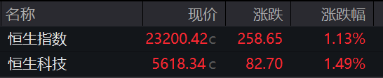 恒生指数开盘涨1.13%,恒生科技指数涨1.49%。小米集团涨近3%,哔哩哔哩涨超3%,好意思团、腾讯控股涨超2%。