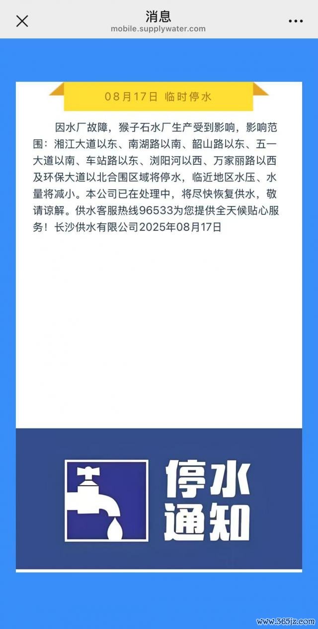 8 月 17 日早,长沙多个小区住户接到临时停水见知。长沙水业 96533 公众号也发布临时停水见知:因水厂故障,山公石水厂分娩受到影响,影响限制:湘江大路以东、南湖路以南、韶山路以东、五一大路以南、车站路以东、浏阳河以西、万家丽路以西及环保大路以北合围区域将停水,相近地区水压、水量将减小。本公司已在贬责中,将尽快归附给水,敬请海涵。给水客服热线 96533 为您提供全天候贴心办事!长沙给水有限公司 2025 年 08 月 17 日。
