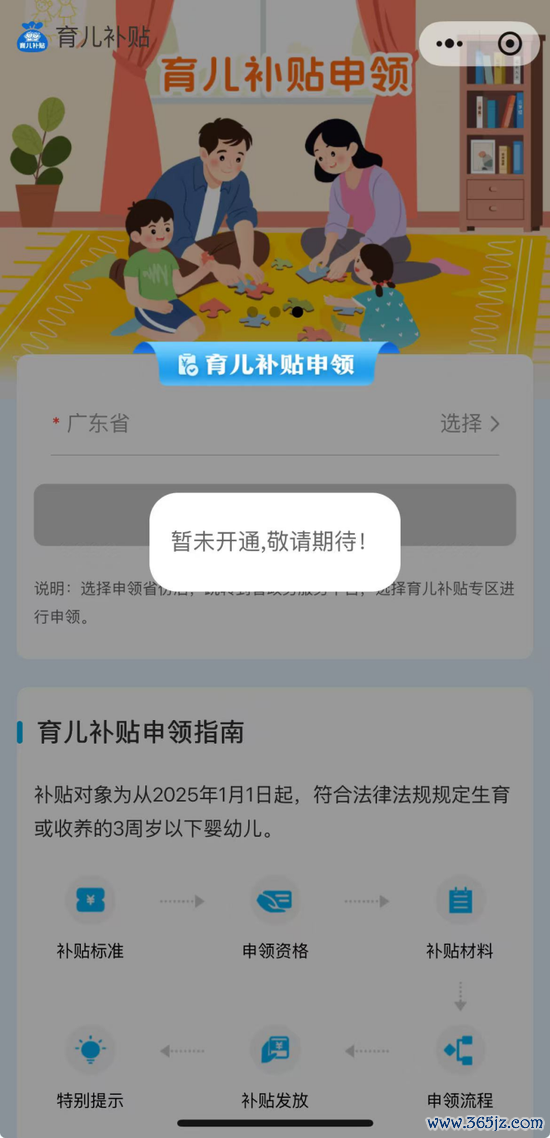 此外,记者驻扎到,微信“育儿补贴”小工夫咫尺也仍是上线,页面炫夸,选拔申领省份后,将跳转到省政务做事平台,选拔育儿补贴专区进行申领。不外,记者尝试选拔具体省份后,均辅导暂未通畅。
