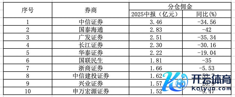 2025年上半年,中信证券以3.46亿元的分仓佣金收入,稳居第一;统一后的国泰海通紧随后来,上半年分仓佣金收入达到2.83亿元;广发证券、长江证券和华泰证券上半年总佣金辨别为2.51亿元、2.30亿元和2.22亿元,排行第三、第四和第五名。国联民生、浙商证券、中信建投、兴业证券和申万宏源排行第六至第十。