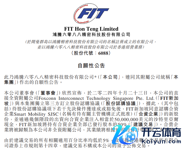 其实,FIT在客岁10月已就上述勾通意向在港交所刊登公告,但公告仅仅称,FIT将透过新加坡子公司向搭伙企业干与5000万好意思元,莫得更多细节。