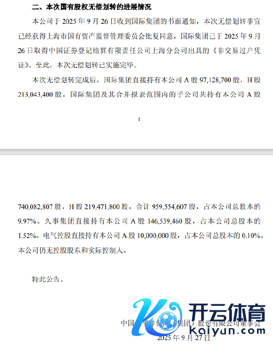 中国太保于2025年9月26日收到上海国外集团的书面讲演,本次无偿划转事宜仍是获取上海市国有钞票监督惩处委员会批复得意,上海国外集团已于2025年9月26日取得中国证券登记结算有限包袱公司上海分公司出具的《非交往过户凭据》。至此,本次无偿划转已本质实现。本次无偿划转完成后,上海国外集团径直执有公司A股9712.87万股,H股2.13亿股,上海国外集团极度统一报表领域内的子公司共执有公司A股7.4亿股,H股2.19亿股,共计9.6亿股,占公司总股本的9.97%。久事集团径直执有公司A股1.47,占公司总股本的1.52%。电气控股径直执有公司A股1000万股,占公司总股本的0.1%。公司仍无控股鼓励和本体戒指东谈主。