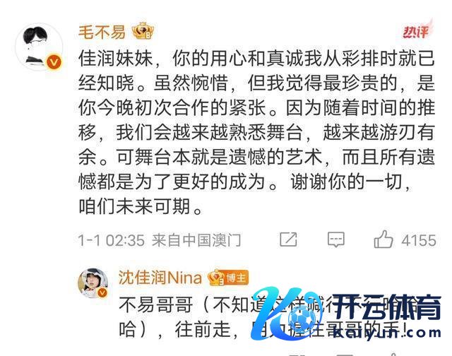 毛不易暖快慰危: 佳润妹妹,你的全心和诚笃我从彩排时就依然领略。固然惘然,但我以为最特等的,是你今晚首次和洽的病笃。因为跟着时期的推移,我们会越来越老到舞台,越来越半谈落发。可舞台本即是缺憾的艺术,何况所有这个词缺憾齐是为了更好的成为。谢谢你的一切体育游戏app平台,我们往常可期。 沈佳润再次回话: 不易哥哥(不知谈这么喊行不成哈哈哈),往前走,使劲持住哥哥的手!