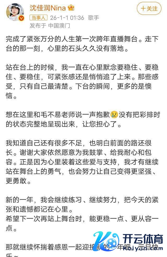 03 沈佳润次日(2026年1月1日)发文跟不雅众以及毛不易谈歉,承认“未呈现彩排水准”,原意往常“链接锻真金不怕火、更稳更沉着”。