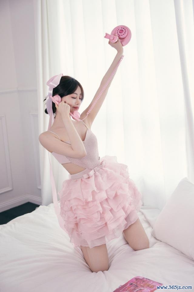 变身甜酷辣妹!短款亮片吊带与荷叶边短裙组合,神勇显现小蛮腰。她跪坐床头,高举粉色复旧旋转拨号电话,俏皮通话的格式充满故事感。个东说念主作风显着,俏皮中带着一点个性。