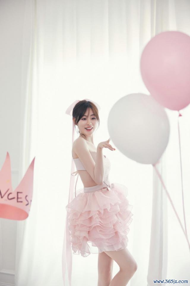 抹胸式淡色上装 + 粉色蓬蓬纱裙,更显邃密锁骨与修长肩颈。头戴秀雅性蝴蝶合髻饰,轻抬右手,搭配画面中的粉色王冠(图中带有" VICES "字样守密)与气球,仿佛一场恢弘的甜心加冕礼。