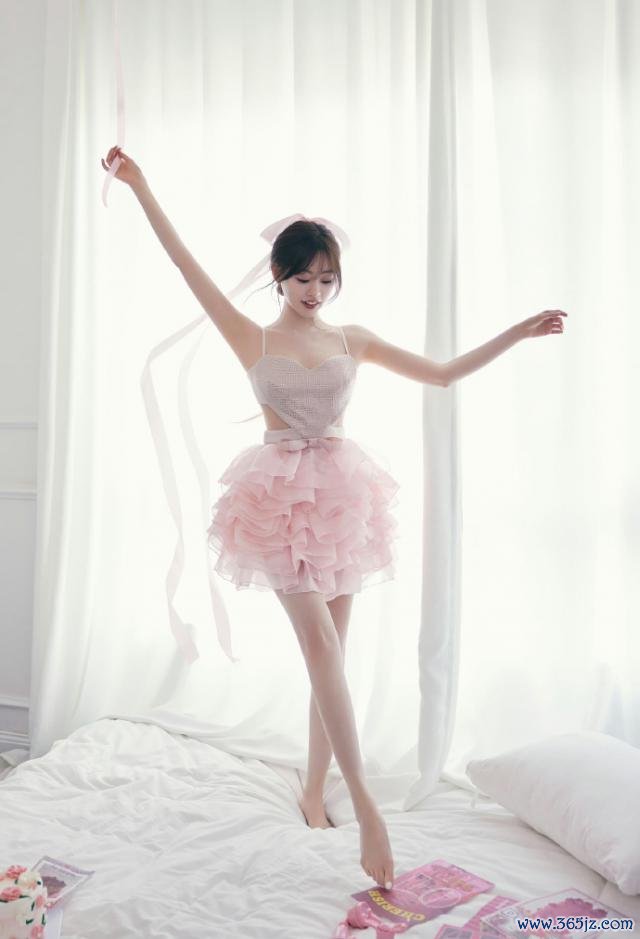 粉色吊带 + 纱裙化身舞台!光脚踏上柔嫩床铺,她舒展手臂,单手高合手粉色飘带,单脚点地,身姿灵动如舞者。这顷刻间不仅定格甜好意思,更展现了她的跳舞功底带来的柔韧与力量感。